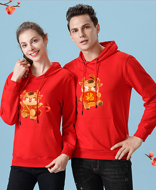 • YDWY201212男女同款2021生肖牛年加絨連帽新年紅色衛衣定制本命年元旦公司年會印logo